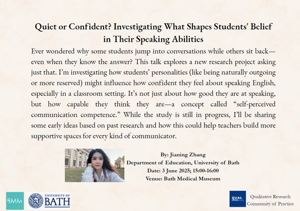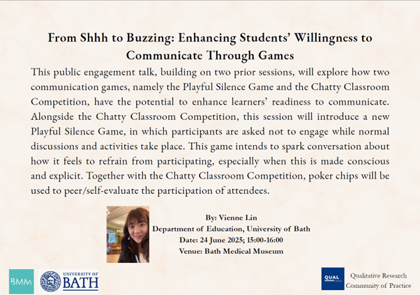 Biography: Vienne Lin is a doctoral researcher in the Department of Education at the University of Bath. Her research focuses on willingness to communicate and class participation. Her work emphasises the creation of a constructive and inclusive learning environment for students from diverse backgrounds and advocates for understanding students’ struggles with class participation from the perspective of willingness to communicate.
